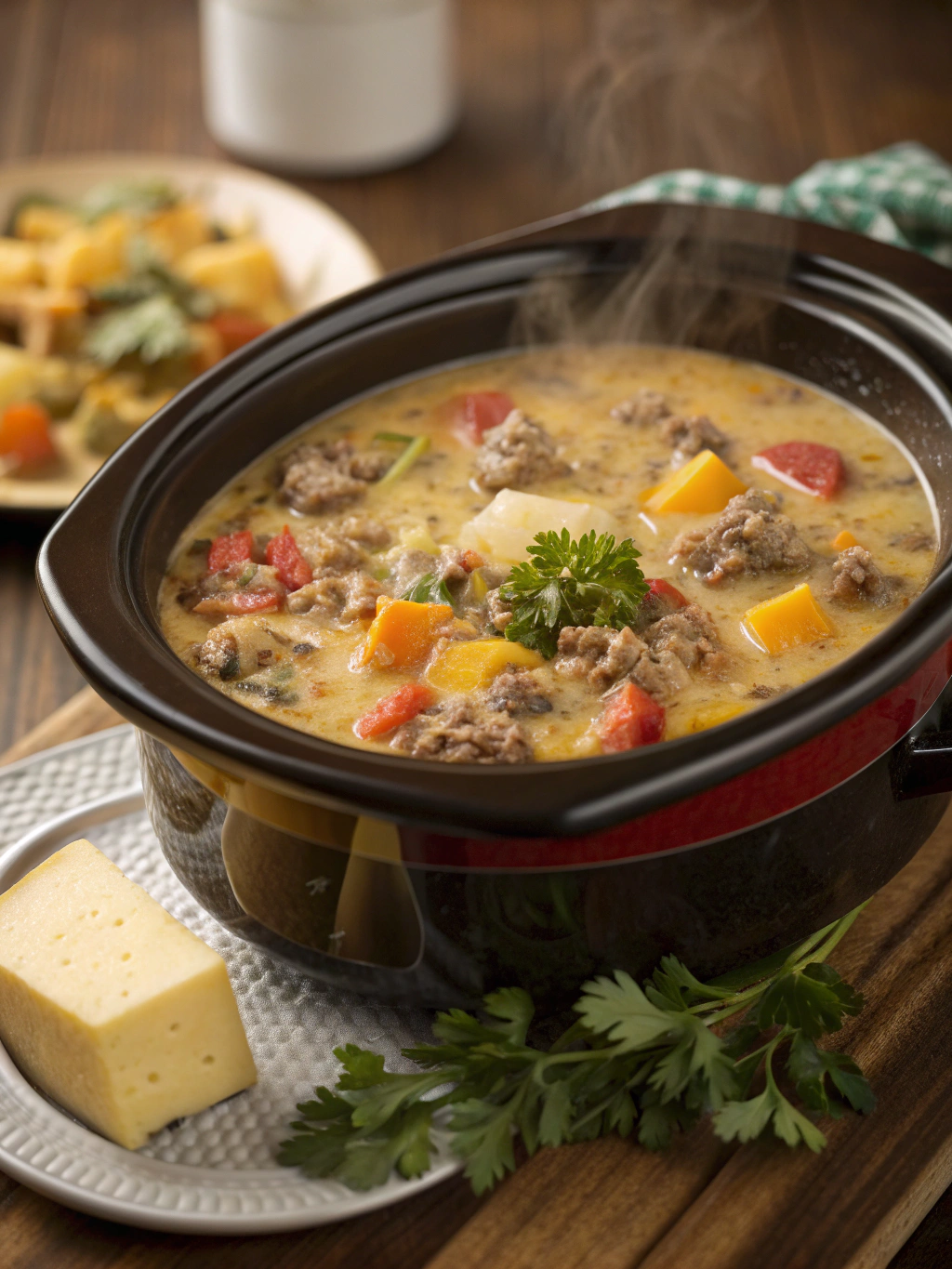Elevate your crockpot cheeseburger soup presentation with thoughtful accompaniments. Serve in warmed bowls topped with crispy bacon bits, fresh chives, and a dollop of sour cream. Crusty sourdough bread or garlic breadsticks provide perfect textural contrast.