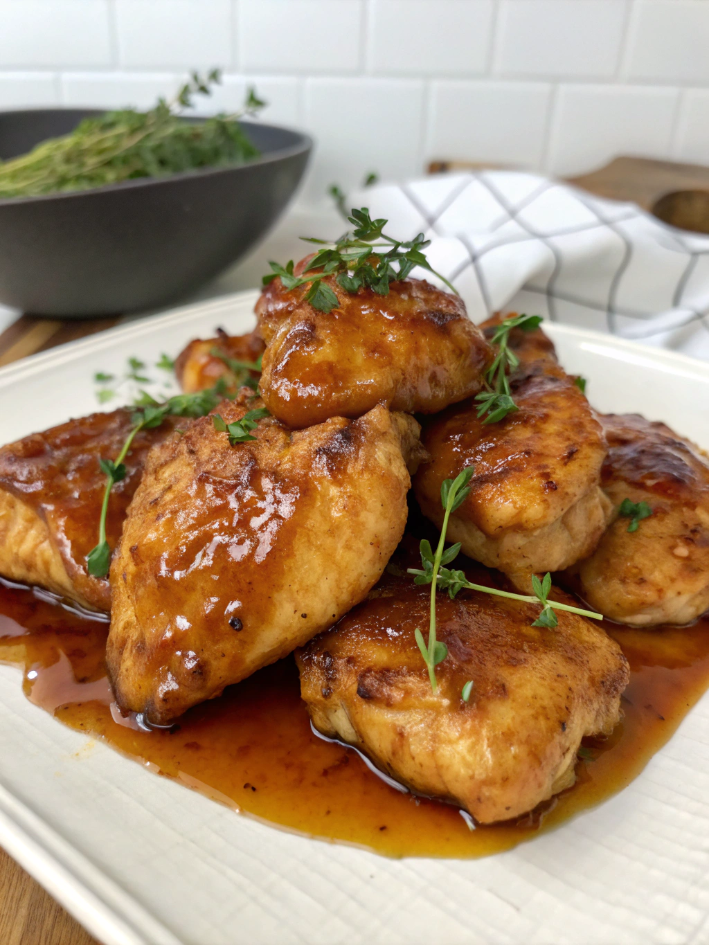 Let rest for 5 minutes before serving. This allows juices to redistribute throughout the chicken while the residual heat finishes caramelizing the glaze. Garnish with fresh herbs and optional nuts.