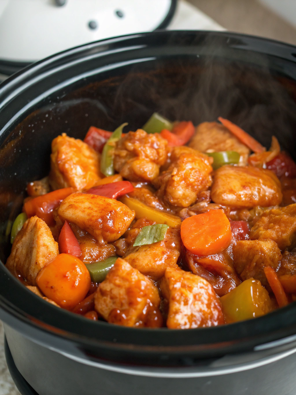 A: Bell peppers, snap peas, and broccoli complement the sweet, tangy glaze with tender chicken perfectly. Add firm vegetables during the last hour of cooking to maintain proper texture and color.